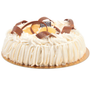 Génoise garnie, crème pâtissière avec lit de poires au sirop, dôme chantilly.